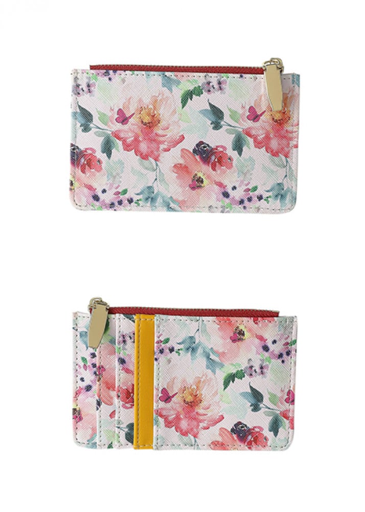 محفظه للعملات المعدنية والبطاقات برسمة زهور بألوان مائية - وردي